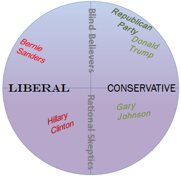But this linear view fails to emphasize an important distinction that exists within both the Left and the Right: Blind Belief vs Rational Skepticism. If we add this dimension, the political world is better represented by a sphere divided into four quadrants: